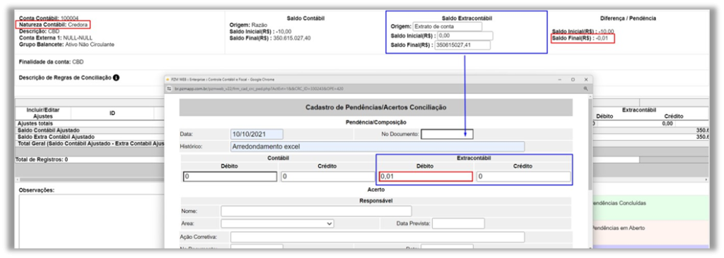 Se a capa é Credora e há diferença no campo “Extra contábil”: