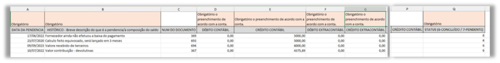 • Colunas D, E, F e G – Débito ou crédito Contábil / Extracontábil
