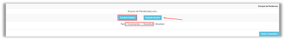 Para facilitar a rotina e reduzir trabalho manual, as pendências também podem ser incluídas por carga em massa. Isso permite que você registre vários ajustes de uma só vez, com muito mais velocidade e segurança.