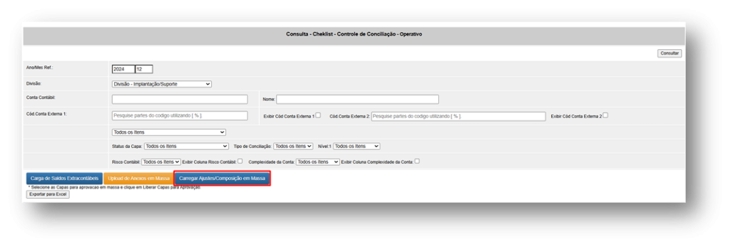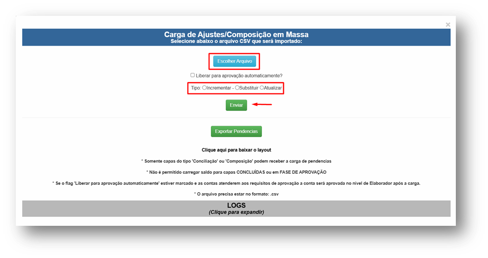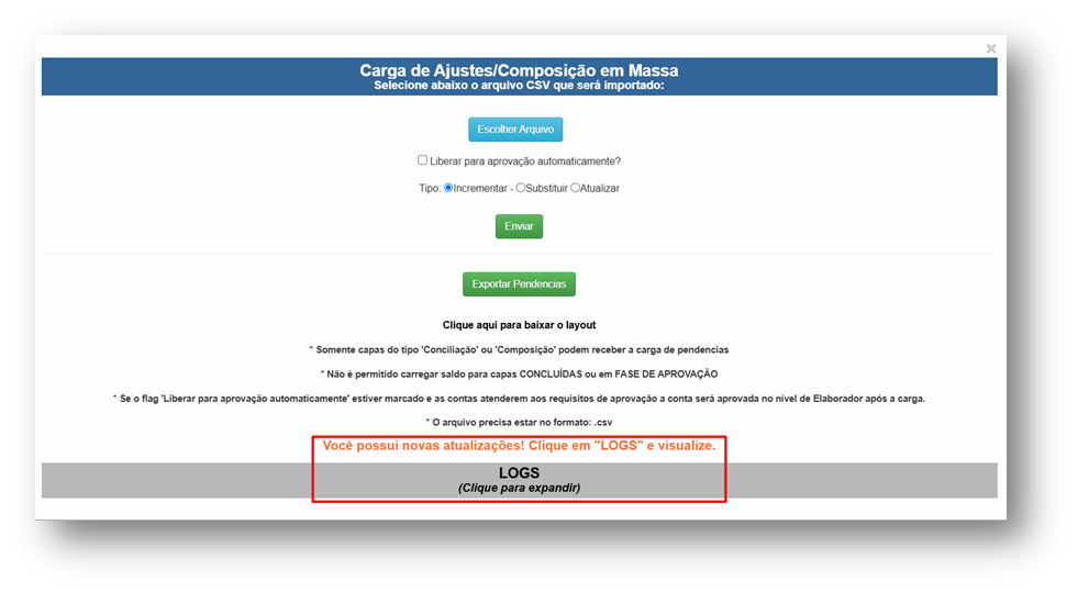 Em ambos os casos, as regras de preenchimento na carga em massa seguem a mesma lógica da inclusão manual de pendências (natureza da conta, local do ajuste e respeito ao sinal da capa), garantindo padronização e evitando inconsistências.
