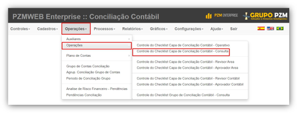 Acessamos a tela de consulta do checklist, através do menu: Operações → Operações novamente Controle do Checklist Capa de Conciliação Contábil – Consulta.