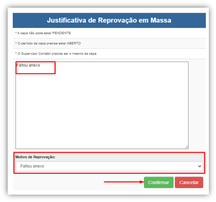 Ao clicar em “Reprovar em Massa Capas Selecionadas”, o sistema abrirá um pop up para que possa efetuar o processo.