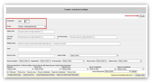Ao acessar a tela de consulta insira o Ano/Mês Ref do balancete no filtro, selecione a divisão do checklist gerado e clique em consultar: