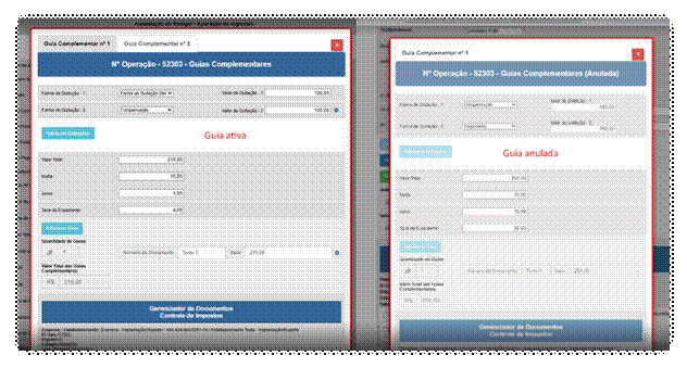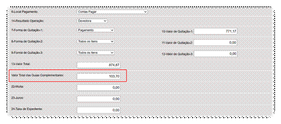 Todas as guias complementares que tiveram processamento de capa terão os seus valores inseridos no campo “Valor Total das Guias Complementares” das apurações originais ou retificadoras as quais as complementares pertençam.