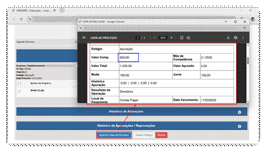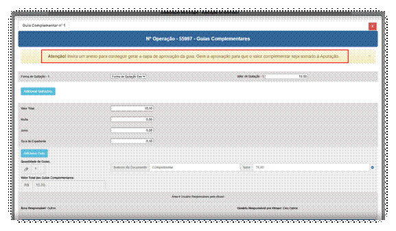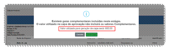 Ao realizar reenvio da guia para aprovação, o sistema exibirá pop up indicando o valor real que gerou capa (que em suma corresponde ao valor da apuração sem as complementações).