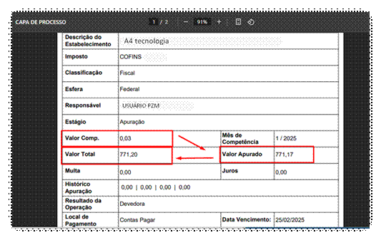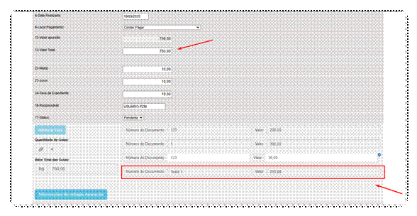 O valor apurado assume o valor da capa original/retificada e o valor total será a soma entre o valor apurado e o valor das guias complementares existentes.