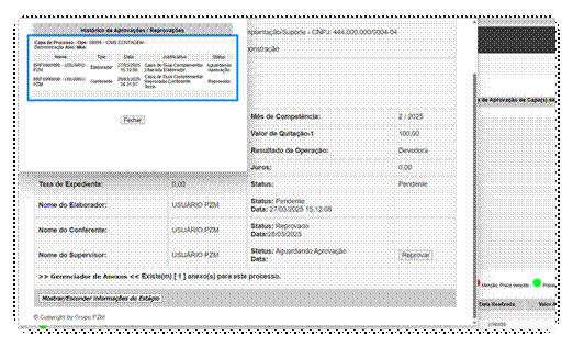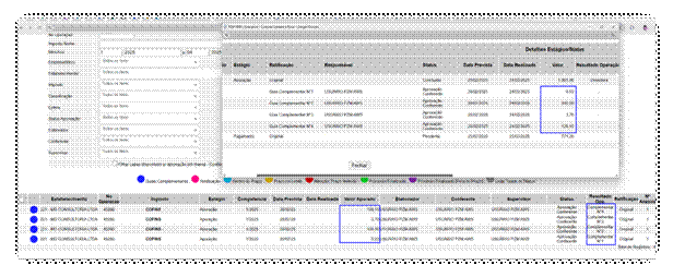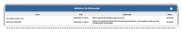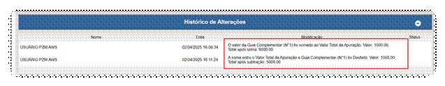 Cada reprovação manterá um registro na aba da guia complementar reprovada, indicando os movimentos de liberações e reprovações ocorridos durante a execução do processo. Além disso, como a reprovação anula os valores inseridos na apuração, haverá também um registro no histórico de alterações da apuração à qual a guia complementar pertence, indicando a subtração do valor correspondente à guia complementar reprovada.