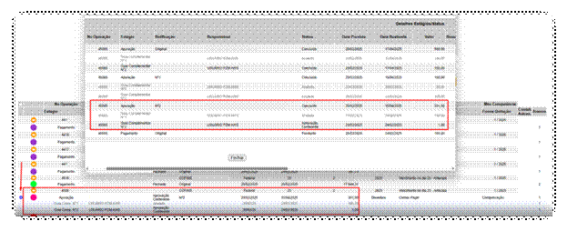 Para exibição nas telas de checklist, basta clicar no ícone de “” disponível para toda operação que possua guia complementar. Ao clicar, o sistema exibirá todos os complementos que a apuração em questão recebeu (incluindo as anuladas).