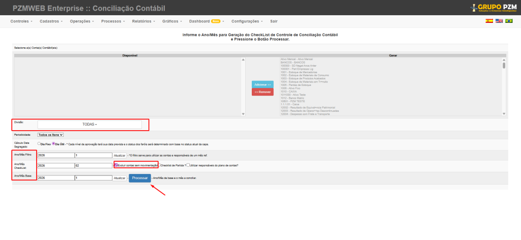 • Ano/Mês Checklist: corresponde ao mês em que será realizada a conciliação. Em regra, trata-se do mês subsequente ao mês de competência.